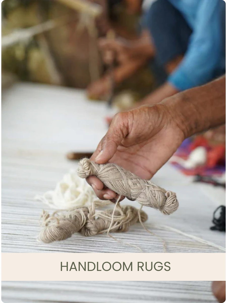Handloom rugs mimic a knotted look with faster production. Woven row by row, they feature dense piles, linear patterns, and hand-finished details, balancing tradition with efficiency.